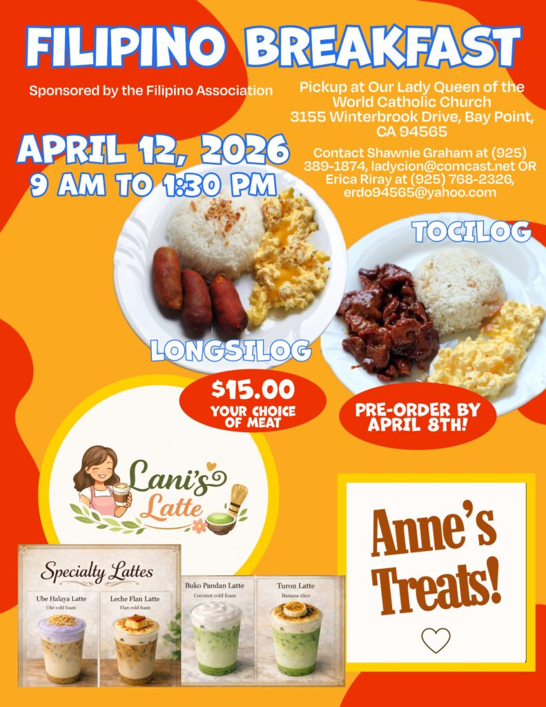 The Filipino Association will be selling a Filipino Breakfast on April 12th between 9 AM and 1:30 PM! $15.00 for a generous portion of garlic rice, scrambled eggs, and your choice of meat between Longanisa and Tocino.