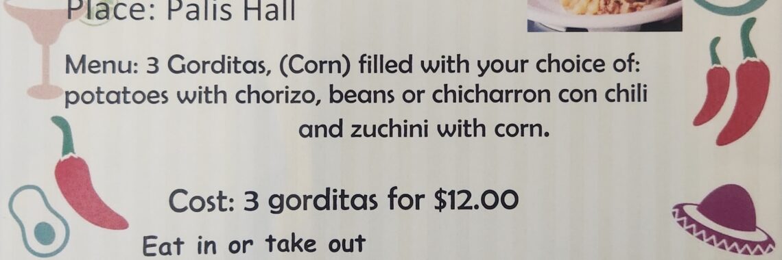 Hispanic Breakfast April 19, 2026, 9:00 am to 11:30 am 3 (Corn) Gorditas, filled with your choice of:Potatoes with chorizo, Beans or Chicharron con chili, and zucchini with corn. $12.00 Contact Paty Ruvalcaba (925) 395-1835