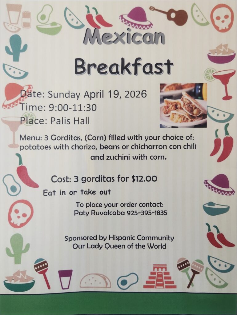 By webadmin@olqw.orgApril 17, 2026Category: Weekly BulletinTags: Hispanic Community Hispanic Breakfast April 19, 2026, 9:00 am to 11:30 am 3 (Corn) Gorditas, filled with your choice of:Potatoes with chorizo, Beans or Chicharron con chili, and zucchini with corn. $12.00 Contact Paty Ruvalcaba (925) 395-1835
