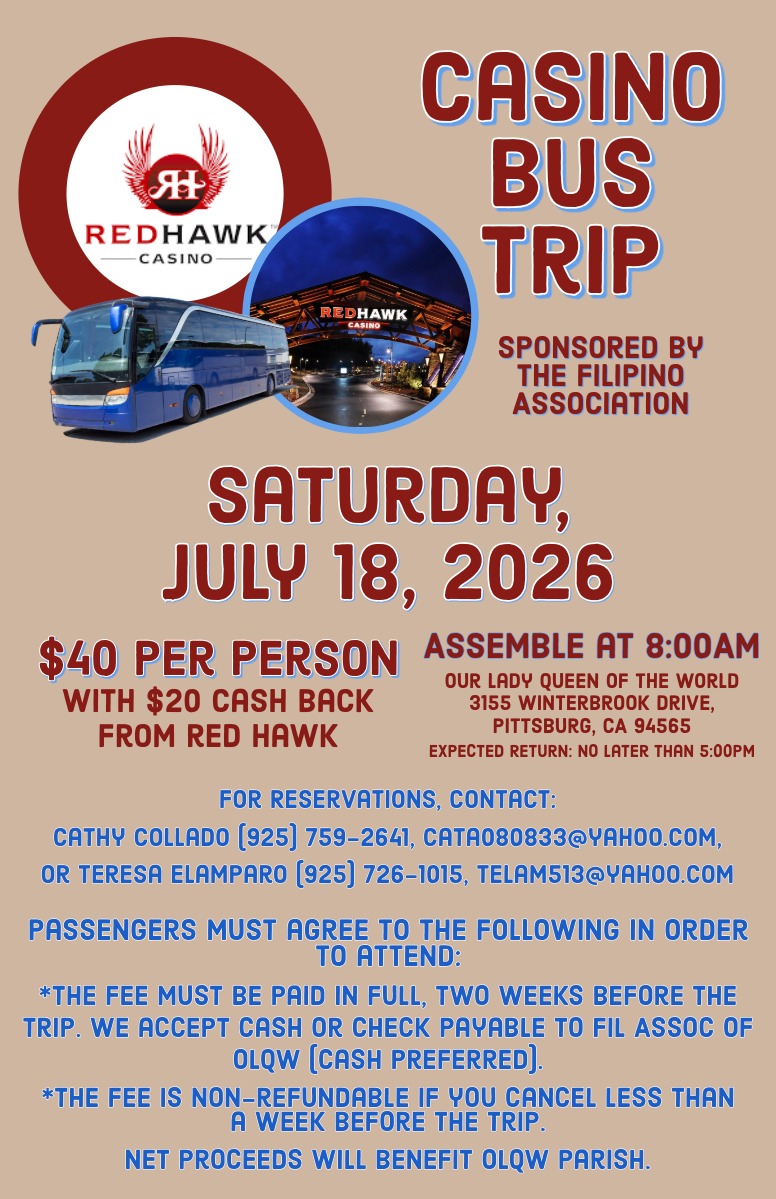 - The fee must be paid in full two weeks before the trip. We accept cash or check payable to the Filipino Association of OLQW (cash is preferred).